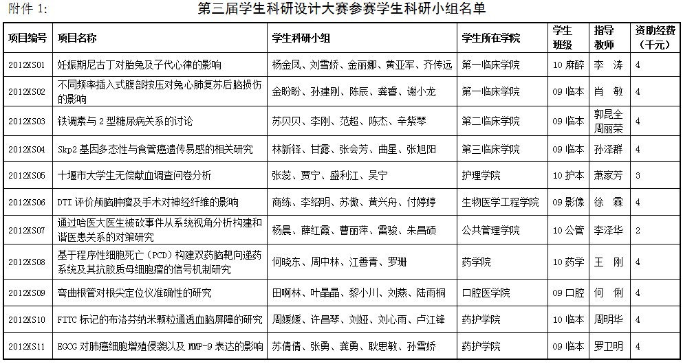 三、本次大赛的参赛学生小组在2012年学校学生科研基金立项的基础上产生(具体名单见附件1)。