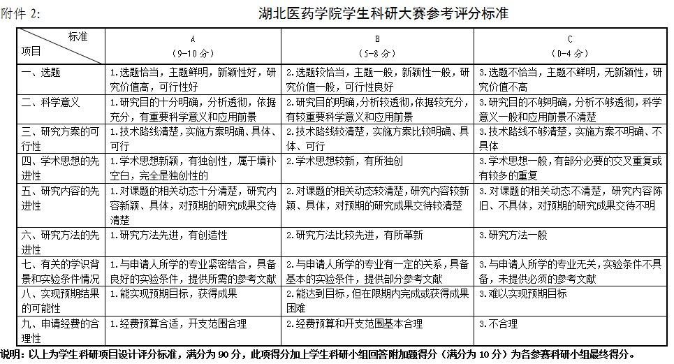 1、学生科研小组长按抽签顺序依次上台陈述课题设计,时间控制在6分钟以内。参赛幻灯片统一按以下提纲进行制作:一是立论依据(包括项目的研究意义、国内外研究现状分析);二是研究方案;三是项目创新点;四是年度研究计划及预期研究结果。评审专家对各参赛小组课题设计情况进行打分,参考评分标准见附件2。