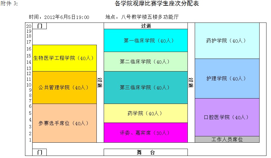 3、请各相关学院务必按学校分配的名额组织观摩学生到赛场观赛(各学院观摩比赛学生座次分配表见附件3)。